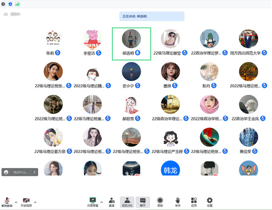 参会导师们依次以视频的方式向同学们表示欢迎。侯选明老师详细介绍了参会导师的研究方向、科研成果等基本概况,以便学生能够结合自身研究兴趣与发展规划顺利达成导师选报意向。2022级硕士研究生依次从毕业学校与专业、目前所学专业、兴趣爱好、学业计划与目标等方面向导师们进行了简要汇报。