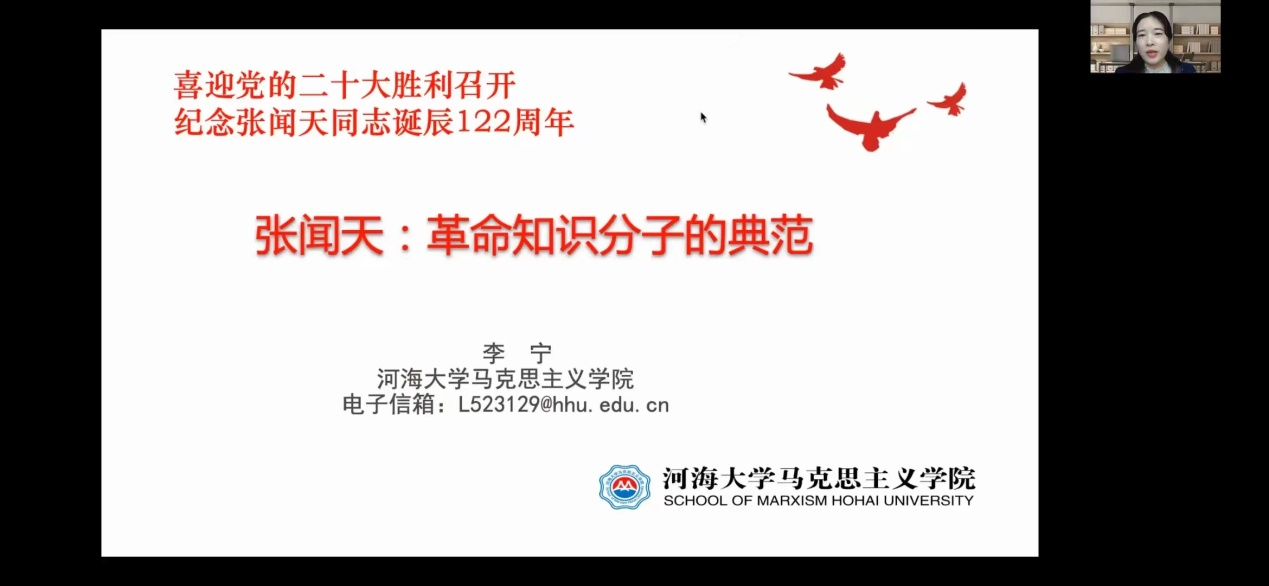 10月17日下午,应新葡萄8883官网AMG邀请,河海大学李宁教授线上为新葡萄官网师生作了题为《张闻天:革命知识分子的典范》的学术讲座,此次讲座由新葡萄8883官网AMG副院长马俊峰教授主持。