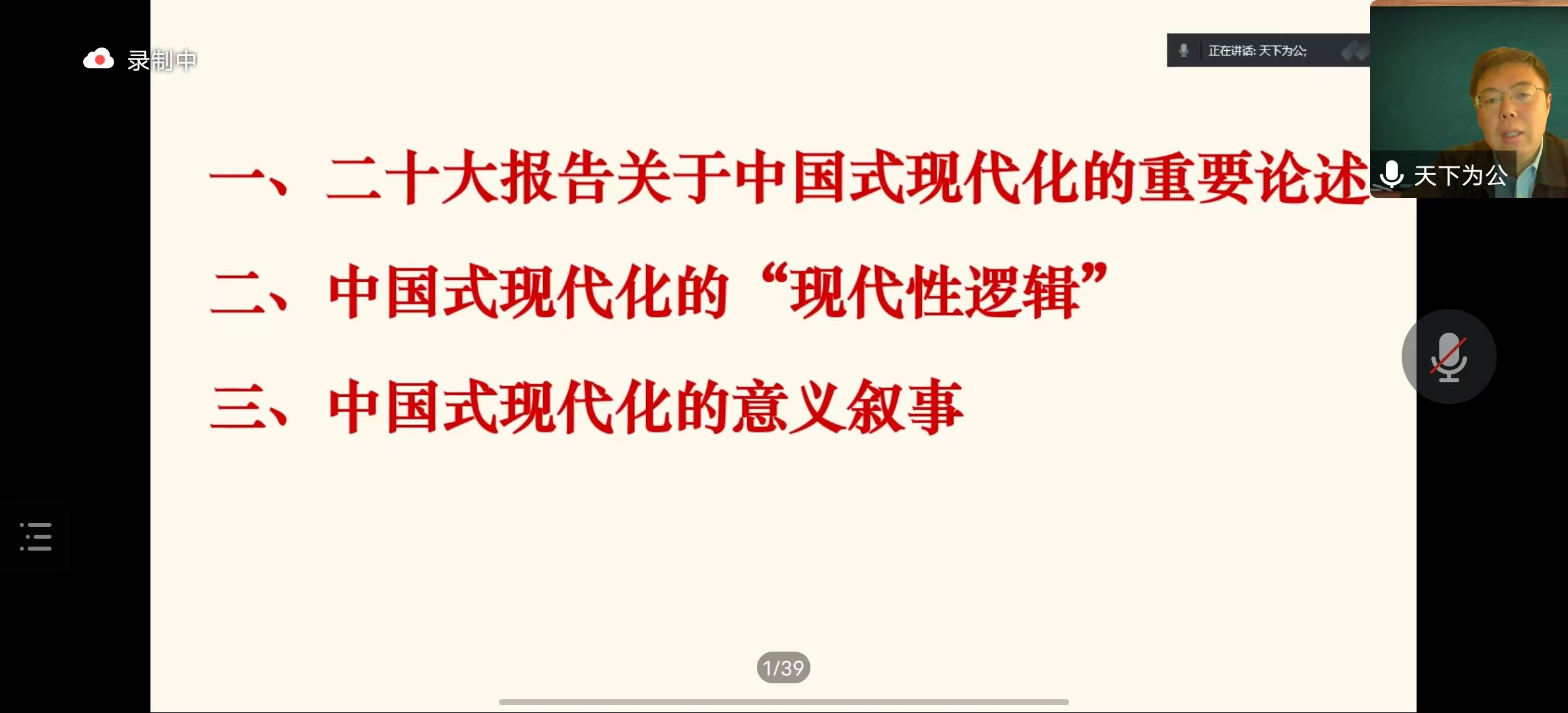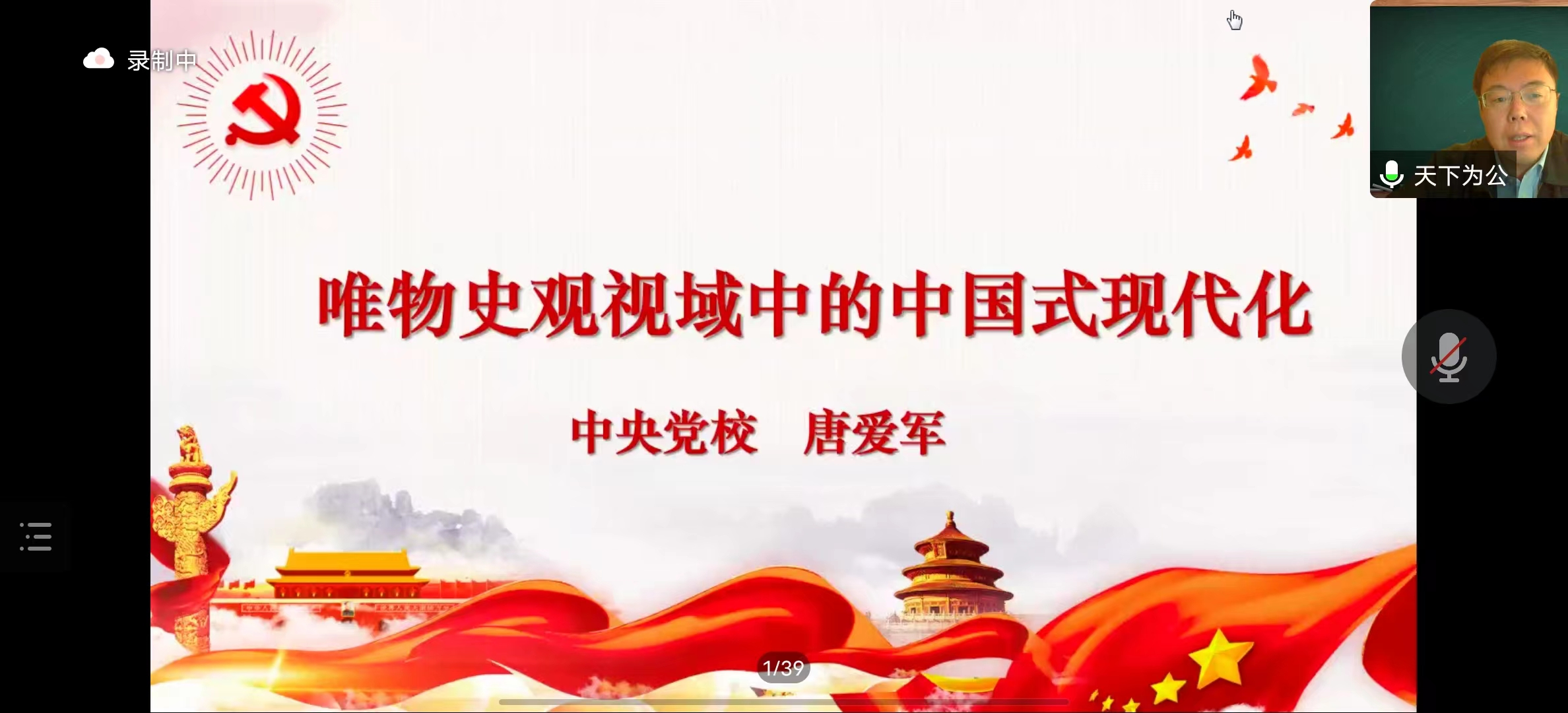 10月21日下午,应克思主义学院邀请,中央党校唐爱军教授线上为新葡萄官网师生作了题为《唯物史观视域中的中国式现代化》的学术讲座,此次讲座由新葡萄8883官网AMG副院长马俊峰教授主持。