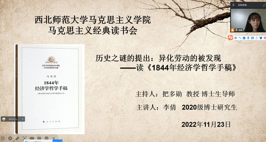 11月23日晚,第二十七期马克思主义经典读书会在腾讯会议举行。2020级博士研究生李倩以“历史之谜的提出:异化劳动的被发现——读《1844年经济学哲学手稿》”为题,对《1844年经济学哲学手稿》进行文本分析。读书会由学院博士生导师把多勋教授主持,百余名硕博士研究生通过线上方式踊跃参加。