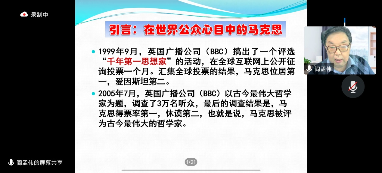 11月25日下午,应新葡萄8883官网AMG邀请,南开大学阎孟伟教授线上为新葡萄官网师生作了题为《如何看待马克思主义理论在当代的意义》的学术讲座,此次讲座由新葡萄8883官网AMG马俊峰教授主持。