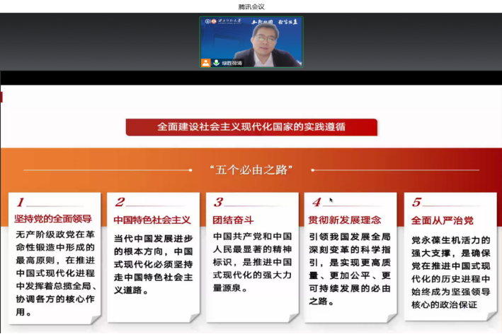 紧接着,史小宁院长切入宣讲主题,围绕全面建设社会主义现代化国家的实践基础、理论指导、中国特色、当代意义以及实现路径五个方面展开了精彩的讲述。指出十九大以来极不寻常、极不平凡的五年、新时代十年我们经历的“三件大事”、新时代伟大变革的历史性胜利与标志性成果为全面建设社会主义现代化国家提供了实践支撑;强调马克思主义是我们党立党立国、兴党兴国的根本指导思想,要牢牢把握这一“源头活水”思想特征,在实现“两个结合”的基础上不断开辟马克思主义中国化时代化的新境界,这是全面建设社会主义现代化国家的理论遵循和行动指南;从社会形态、表现形式、制度属性三个层面对“中国特色”进行了深刻剖析,重点解读了中国式现代化的中国特色、本质要求以及重大原则;从理论、实践、价值及世界维度阐释了全面建设社会主义现代化国家的当代意义。最后,重点围绕首要任务、应有之义、前进方向、重要内容以及根本保证五个方面详细讲述了全面建设社会主义现代化国家的实现路径。