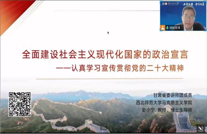 为深入学习宣传贯彻党的二十大精神,深刻把握党的二十大召开的重大现实意义,不断增强学习阐释党的二十大精神的研究力度、理论深度和学术厚度,不断推进党的二十大精神融入思想政治理论课教学。11月8日下午,新葡萄8883官网AMG院长史小宁教授为全校百余名2022级博士研究生、学院青年教师和硕士研究生作了题为《全面建设社会主义现代化国家的政治宣言——认真学习宣传贯彻党的二十大精神》的宣讲报告。