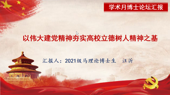 论坛中,11名博士研究生分别就个人研究方向及论文成果进行了学术交流,分别作了“中国周边命运共同体构建的三重逻辑”“中国式现代化道路的价值追求及现实启示”“中国式现代化道路的多维优势探析”“以伟大建党精神夯实高校立德树人精神之基”“国家治理现代化视域下社会主义核心价值观引领作用探析”等主题的研究成果汇报,体现出较为扎实的理论基础和良好的学术素养。