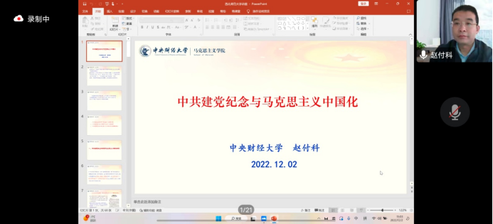 12月2日下午,应新葡萄8883官网AMG邀请,中央财经大学赵付科教授线上为新葡萄官网师生作了题为《中共建党纪念与马克思主义中国化》的学术讲座,此次讲座由新葡萄8883官网AMG马俊峰教授主持。