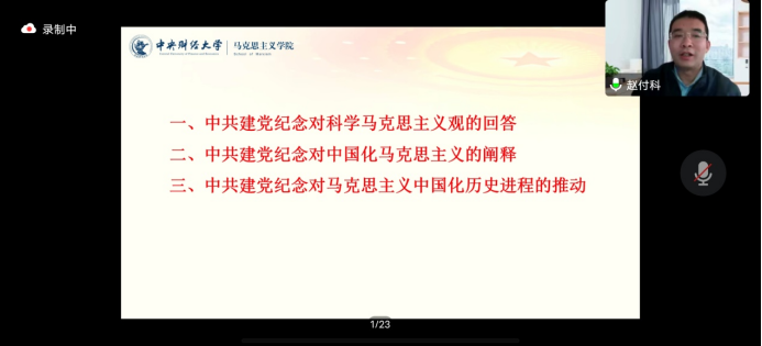 赵付科教授认为中国共产党建党纪念是重要的政治仪式,有其独特的社会功能。首先,从马克思主义中国化视域来看,中国共产党建党纪念从本体论、价值论、实践论等方面,对什么是马克思主义、如何评价马克思主义、怎样对待马克思主义作出了科学回答,树立了科学的马克思主义观;其次,赵付科教授提出中国共产党建党纪念对毛泽东思想、中国特色社会主义理论体系、习近平新时代中国特色社会主义思想进行了科学概括,阐释了马克思主义中国化理论成果;最后,赵付科教授讲到中国共产党建党纪念为马克思主义中国化提供了强大动力、奠定了文本基础、夯实了群众根基,推动了马克思主义中国化历史进程。