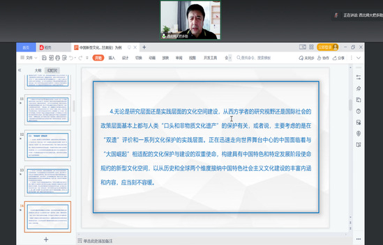 12月11日下午,学院研究生学术月第三期“博导论坛”通过腾讯会议线上举办。把多勋教授作了题为《中国新型文化空间构建研究:以长征国家文化公园(甘肃段)为例》的学术报告。报告由新葡萄8883官网AMG周方副教授主持,部分青年教师及百余名硕博士研究生踊跃参加。