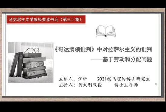 12月13日晚,第三十期马克思主义经典读书会在腾讯会议举行。2021级博士研究生汪沂以《<哥达纲领批判>中对拉萨尔主义的批判—基于劳动和分配问题》为题,对《哥达纲领批判》第一章进行文本解读。读书会由学院博士生导师岳天明教授主持,学院部分教师、百余名硕博士研究生通过线上方式踊跃参加。