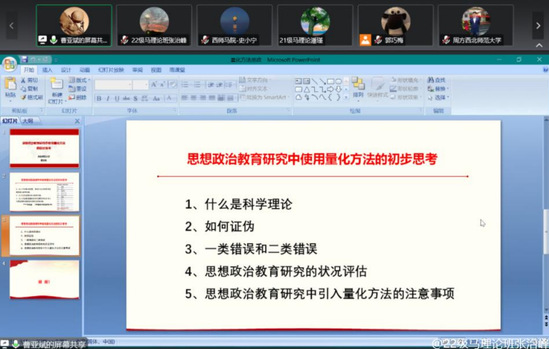 报告结束后,曹亚斌教授线上与参会师生互动交流并就提出的相关问题进行了深刻细致的解答。周方老师对报告进行了总结,指出曹亚斌教授的报告对我们寻找思想政治教育的创新点,扩充思想政治教育的研究方法具有很大的启示意义。