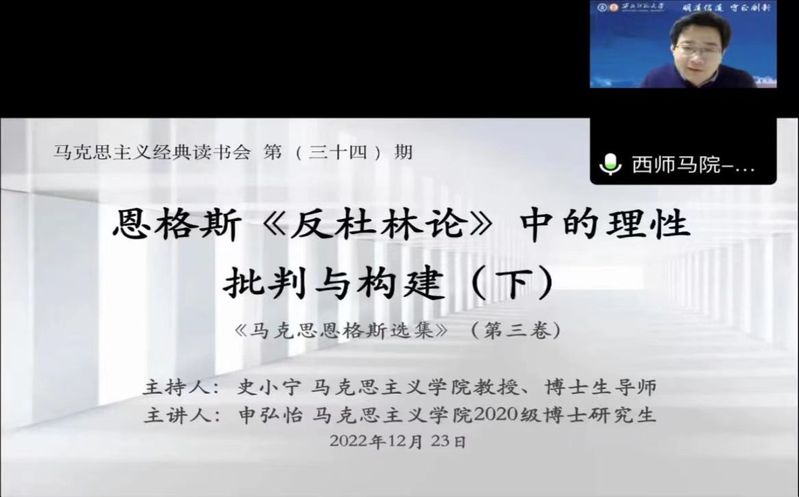 12月23日晚,第三十四期马克思主义经典读书会在腾讯会议线上举行。2020级博士研究生申弘怡以《恩格斯<反杜林论>中的理性批判与构建》(下)为题,对《反杜林论》进行文本分析。读书会由学院院长史小宁教授主持,学院百余名硕博士研究生参加。