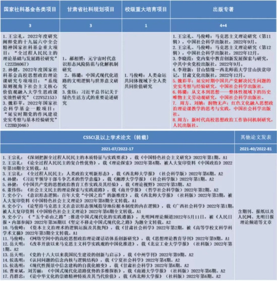 2022年新葡萄官网在科学研究方面收获颇丰,其中王宗礼教授主持项目“全过程人民民主的理论基础和发展路径研究”获批国家社科基金重大项目,项目号为“22ZDA067”;此外,还获批1项国家社科基金高校思想政治理论课研究专项项目,1项国家社科基金一般项目,3项甘肃省社科规划项目,1项校级重大培育项目,出版8部学术专著,在《中国特色社会主义研究》《思想理论教育导刊》等重要刊物上发表CSSCI及以上期刊论文17篇。