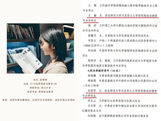 一是学院有较多本科生进入浙江大学、四川大学、兰州大学、华东师范大学等双一流高校深造。二是学生在各类大赛中表现优秀,获得优异成绩,例如新葡萄官网学子在2022年“建行杯”第八届中国国际“互联网+”大学生创新创业大赛甘肃省分赛决赛中获得1金5铜优异成绩等。三是在共青团甘肃省委2022年“甘肃省向上向善好青年”评选活动中,新葡萄官网研究生刘莹雪、本科生王楠分别获得“担当奉献好青年”和“勤学上进好青年”荣誉称号。
