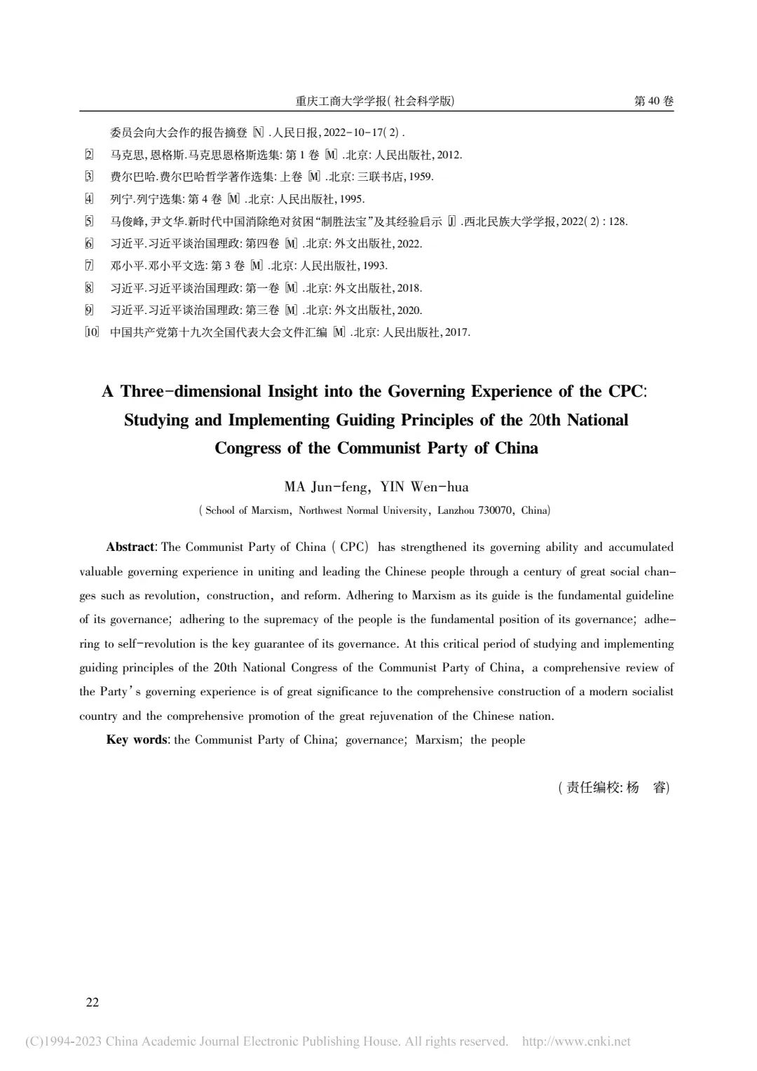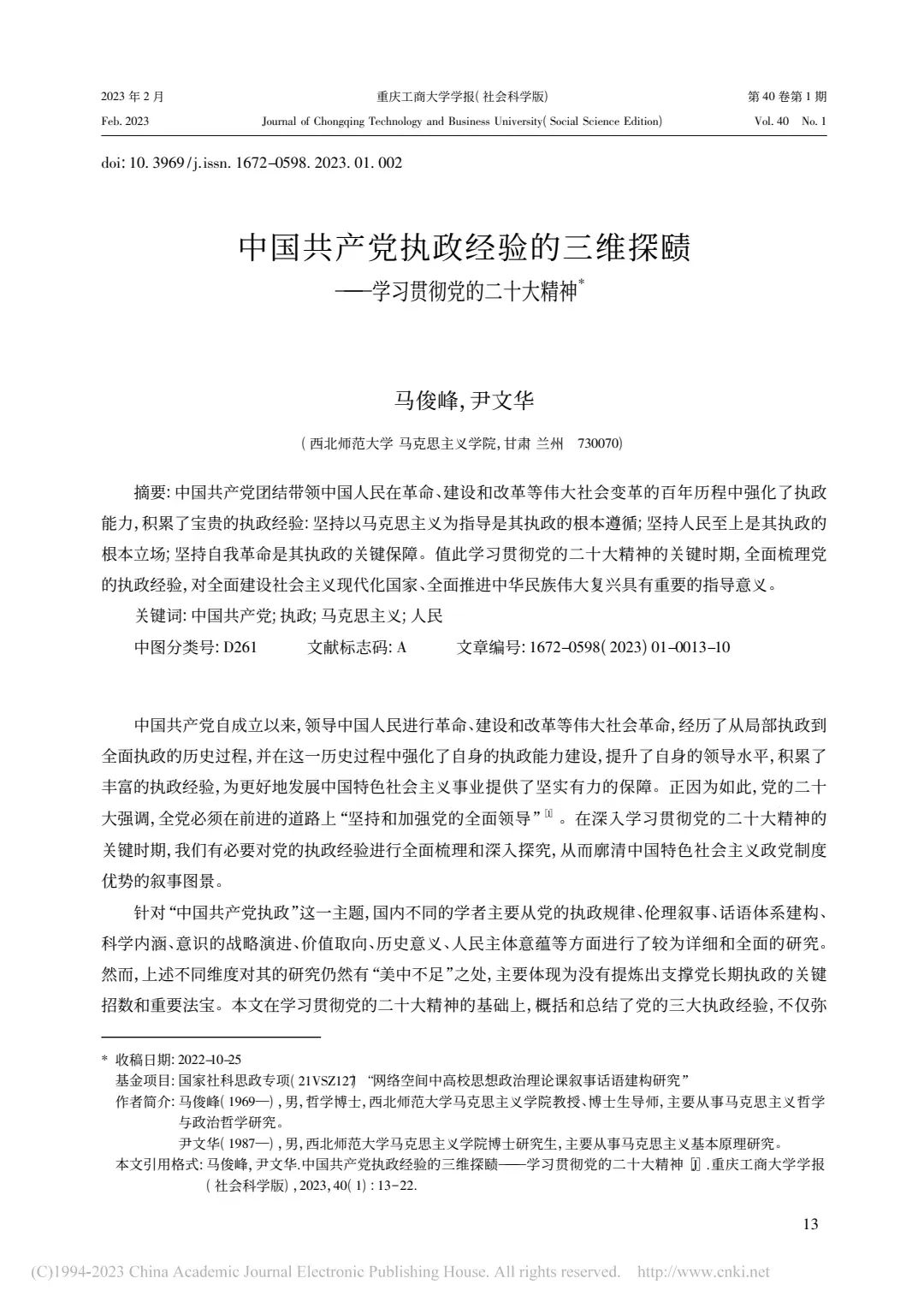 《重庆工商大学学报》(社会科学版)2023年2月第40卷第1期发表新葡萄8883官网AMG马俊峰教授文章《中国共产党执政经验的三维探赜——学习贯彻党的二十大精神》。