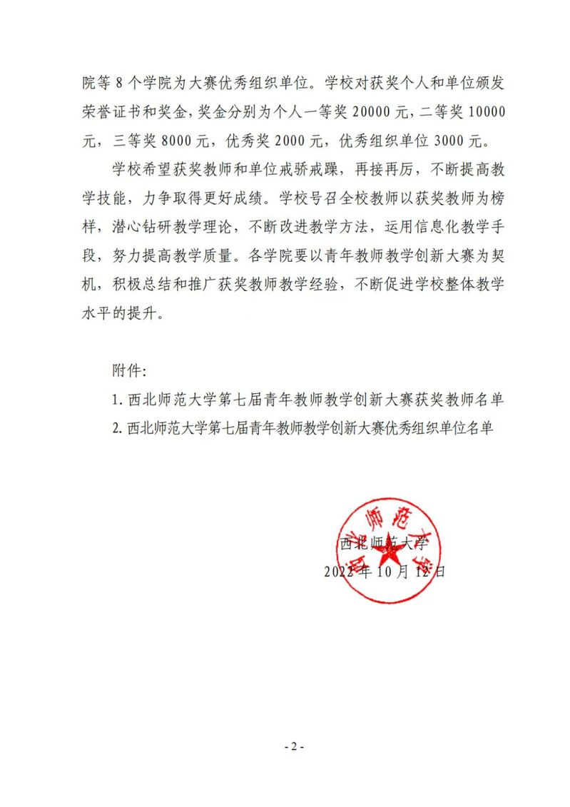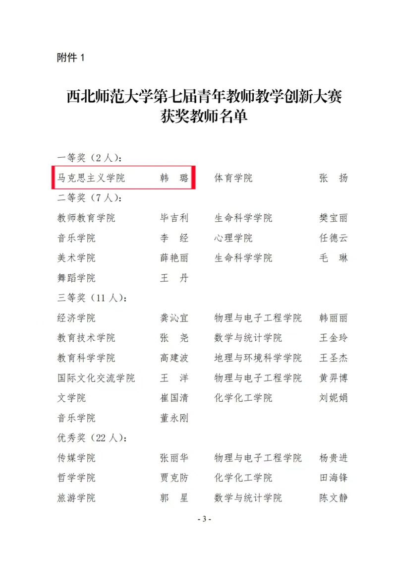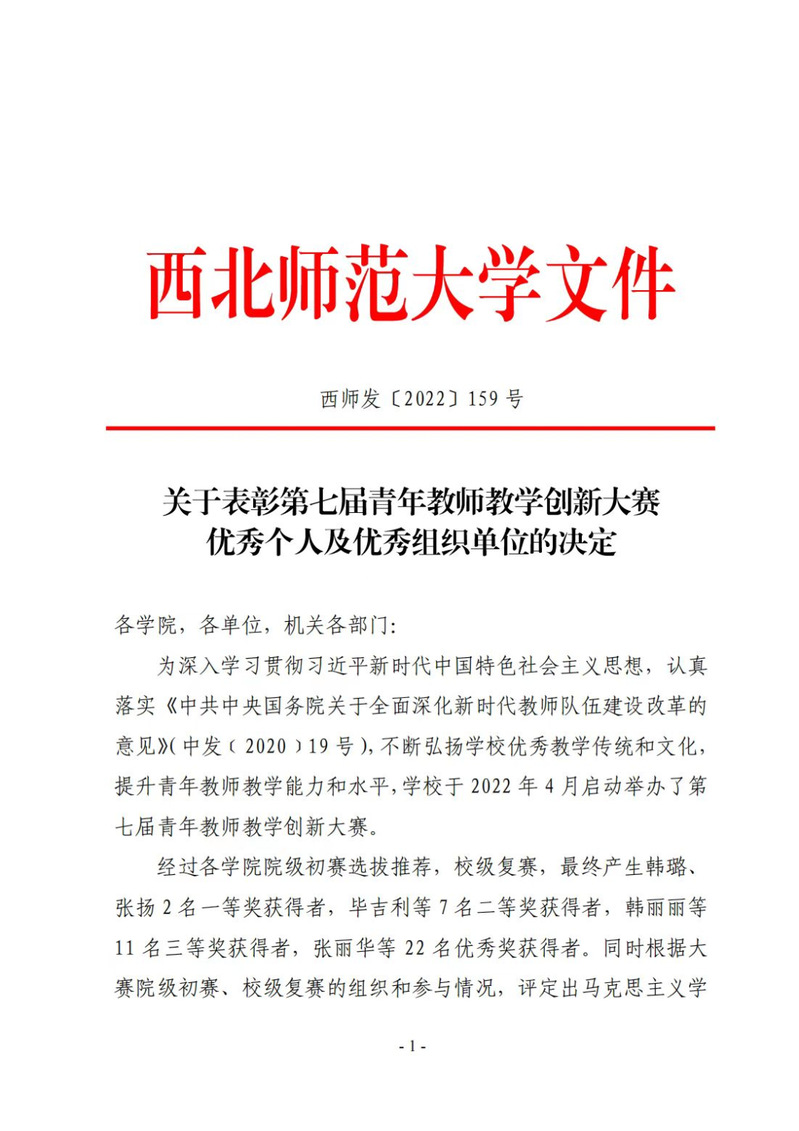 为深入学习贯彻习近平新时代中国特色社会主义思想,认真落实《中共中央国务院关于全面深化新时代教师队伍建设改革的意见》(中发〔2022〕19号),《中共甘肃省委甘肃省人民政府关于全面深化新时代教师队伍建设改革的实施意见》(甘发(2018)21 号),《新葡萄8883官网AMG教师教学奖惩办法》(西师党发(2016)43号)中的“新葡萄8883官网AMG青年教师教学大赛实施方案”,促进青年教师教学创新能力不断提高,推进信息技术与教学的深度融合,推动人工智能赋能教学改革,提升青年教师教学能力,努力打造一流教师队伍,着力培养一流人才,新葡萄8883官网AMG于2022年4月启动举办第七届青年教师教学创新大赛。经过激烈的学院初赛、学校复赛,新葡萄官网青年教师韩璐在大赛中斩获佳绩,荣获一等奖,新葡萄官网被评定为大赛优秀组织单位。