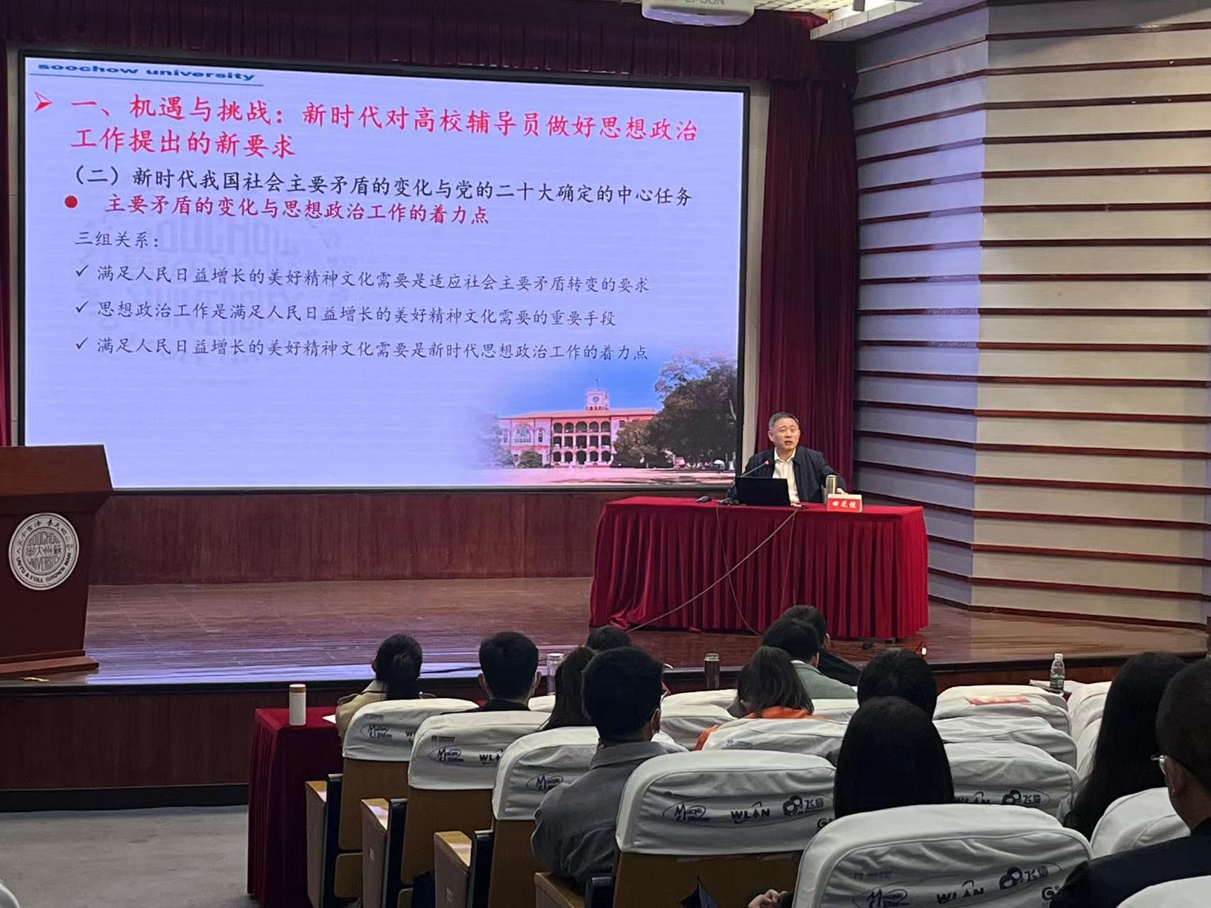 在理论教育与能力提升环节,苏州大学新葡萄8883官网AMG院长田芝健教授作了题为“高校辅导员如何做好新时代思政工作”的专题报告,从“机遇与挑战”“素质与能力”“方法与艺术”三个方面,对新时代高校辅导员做好思想政治教育进行了全面深刻的理论阐释。苏州大学学生工作处处长董召勤围绕“新时代高校辅导员的使命与担当”主题,对高校辅导员明确角色定位,坚定价值追求,以高度的责任感和使命感,落实高校立德树人根本任务进行了深入细致的讲解。苏州大学医学院副书记孟玲玲围绕“沟通从心开始——辅导员谈心谈话工作实例探析”的主题,分析了辅导员与学生有效沟通的理论基础,分享了辅导员成为学生引路人和知心朋友的实践经验;苏州大学团委书记于潜驰围绕“做好高校共青团工作”,分享了坚持思想政治引领、实践育人原则,发挥共青团工作在强化思想教育、支撑人才培养、助力创新就业等方面的经验做法。