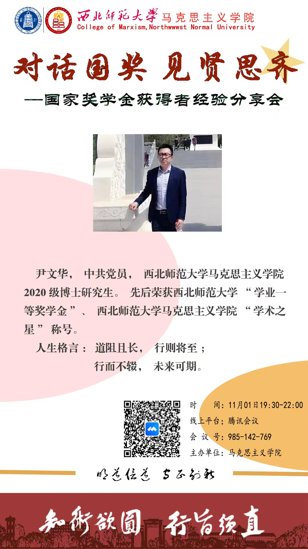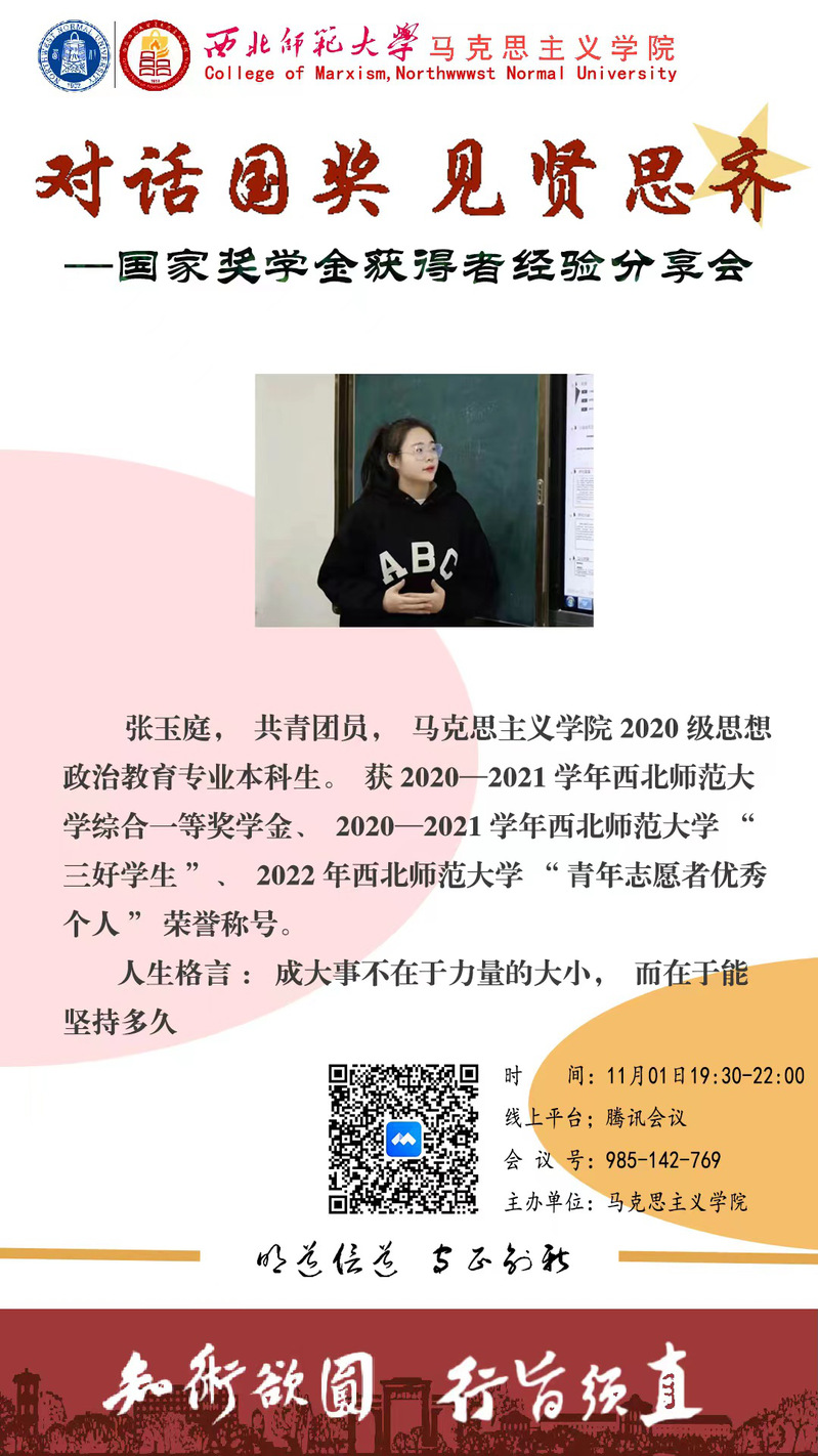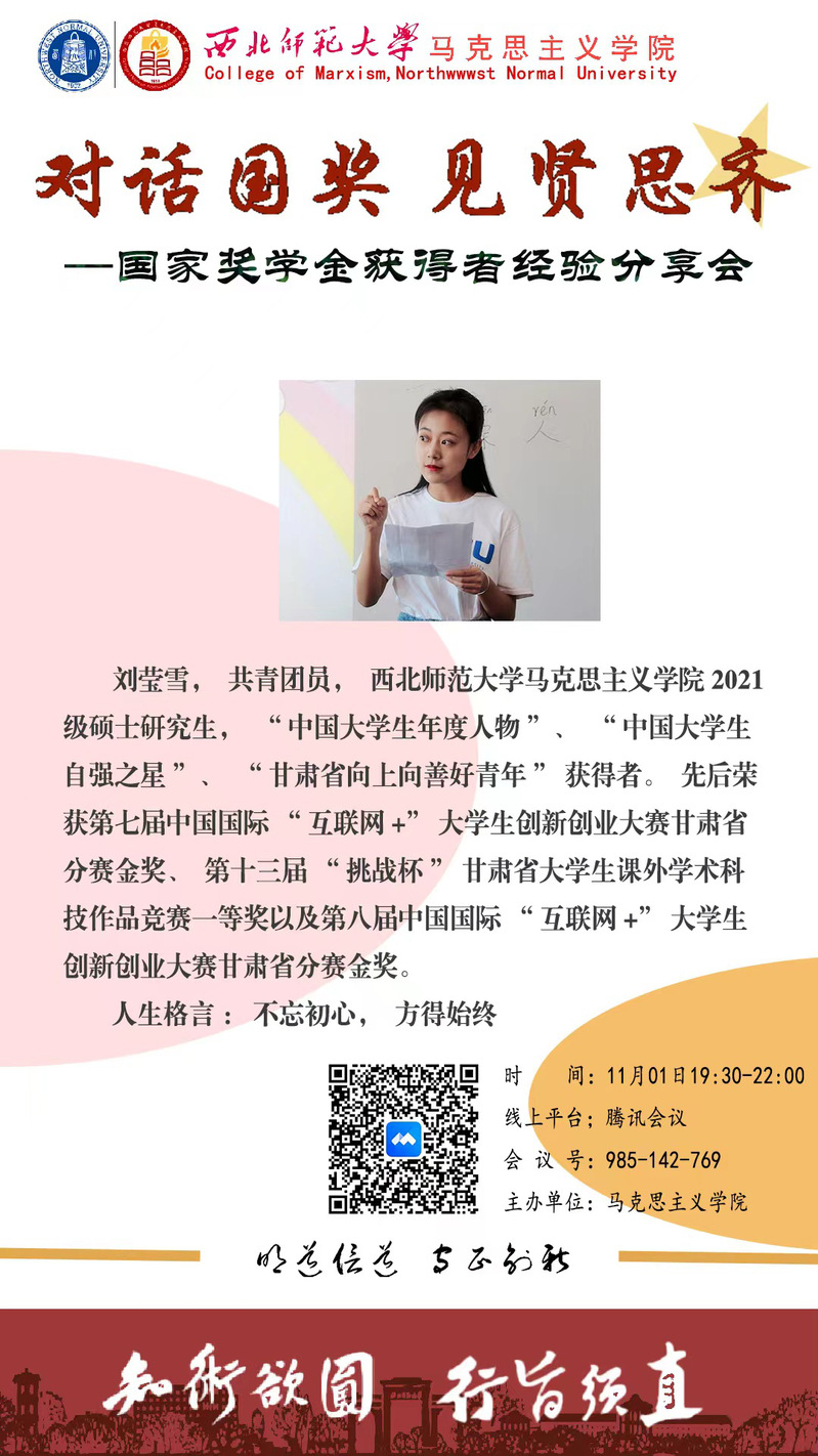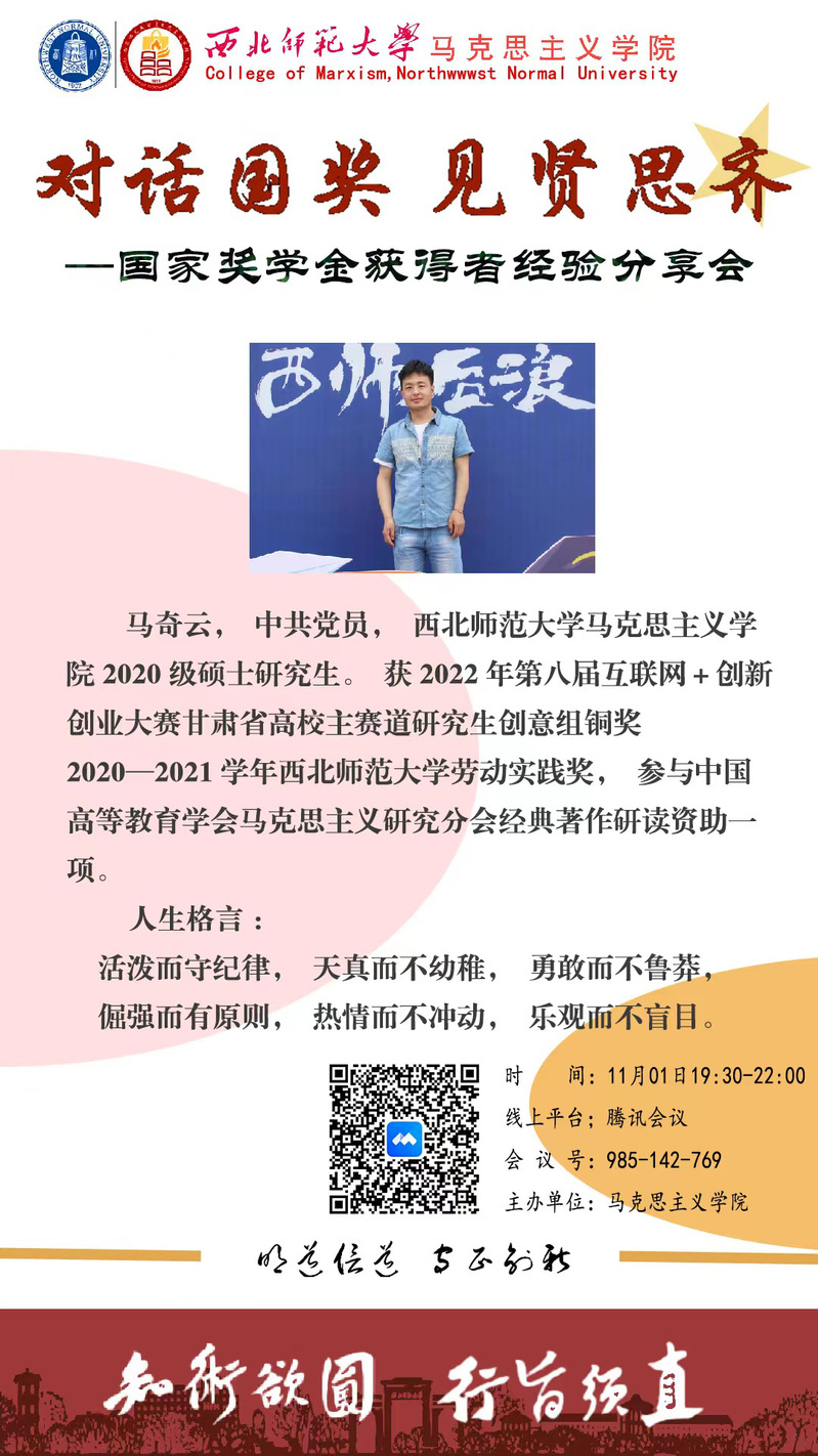 自古成功无捷径、千锤百炼才成钢。成功,是路虽远,行则将至;事虽难,做则可成。为积极发挥大学生优秀典型示范引领作用,充分激活奖助育人激励功能,以榜样的精神凝聚青春力量。新葡萄8883官网AMG特别推出 “对话国奖,见贤思齐”——国家奖学金获得者经验分享会。本次活动,我们邀请到新葡萄8883官网AMG2022年国家奖学金获得者为我们作交流分享,在此汲取榜样力量,激励马院学子继往开来、砥砺奋进。