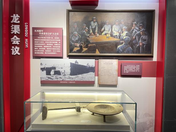 队员们前往龙渠会议遗址参观学习。龙渠会议遗址共分三个展区:第一展区为西路军龙渠会议遗址,由会议室,机要室,领导人居室三部分组成,以历史图片和文物生动还原了龙渠会议的历史场景;第二展区为西路军龙渠战事陈列室,再现了西路军在龙渠浴血奋战的历史;第三战区为龙渠乡红色基因传承陈列室,主要讲述了高金城修渠造福龙渠人民、徐合德道士义救红军排长王怀文、流落西路军战士李怀存的坎坷人生路、新时期龙渠烈士代龙李学涛等的红色故事和英雄事迹。在展区内,实践团成员重温历史,深刻体会到当时红军战士生活之贫苦、工作之艰辛、战斗之激烈、意志之坚毅。纷纷表示要珍惜现在来之不易的美好生活,并继承红色精神,凝聚红色力量,担起国家和人民赋予青年新时代的责任与使命。