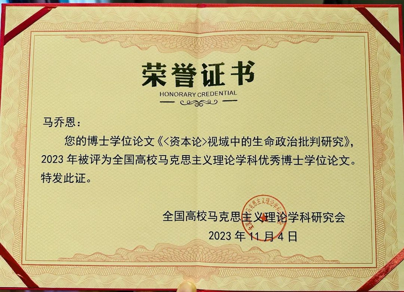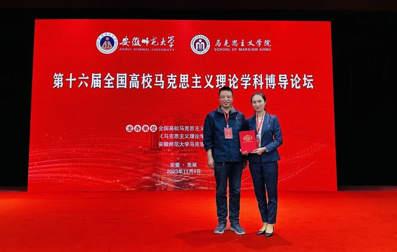 11月4日,全国高校马克思主义理论学科研究会、《马克思主义理论学科研究》编辑部、安徽师范大学新葡萄8883官网AMG共同主办第十六届全国高校马克思主义理论学科博导论坛。会上举行全国高校马克思主义理论学科优秀博士论文颁奖仪式。新葡萄8883官网AMG青年教师马乔恩副教授荣获2022年度全国高校马克思主义理论学科优秀博士学位论文奖。马乔恩的博士论文指导教师为新葡萄8883官网AMG马俊峰教授,题目为《<资本论>视域中的生命政治批判研究》。