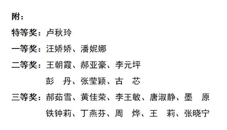 根据学校大赛要求,拟推荐特等奖获得者卢秋玲同学、一等奖获得者汪娇娇、潘妮娜同学于2023年11月18日参加校级比赛。