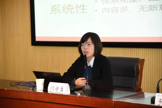 名师分享环节,华东师范大学新葡萄8883官网AMG教授、博士生导师闫方洁重点阐发了《提升“马克思主义基本原理”教学有效性的两个维度》。闫方洁老师以课堂教学案例为切口,提出理论话语的抽象性与内容的现实性融合,以及教学方法、教学内容各要素之间的关系。报告通过大量课程知识点的梳理,指出教学的具体过程需深入社会的教风突显课程的趣味、拓宽问题视域加强总体性意识、跳出概念阐释进行体系构建等方面突出课程的广度、深度和温度。