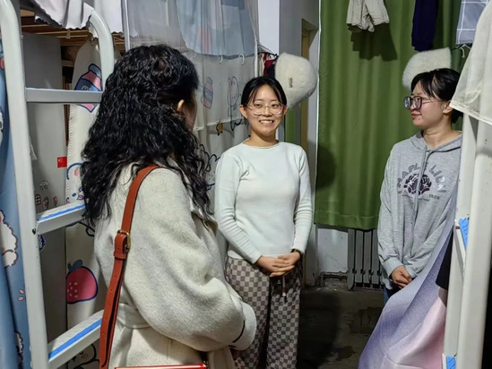 学院党委副书记王宏渊、辅导员闫婧带领各位学生骨干走访了2020级学生宿舍。在走访过程中,王宏渊书记向学生们分享了时代发展的新趋势,并强调了在机遇与挑战并存的环境中,大家应如何做好未来的职业生涯规划。她提出,同学们需要对就业市场和考研形势有深入的了解,并相应地提升自己的知识储备和职业技能。