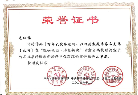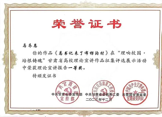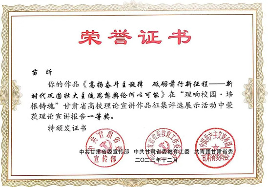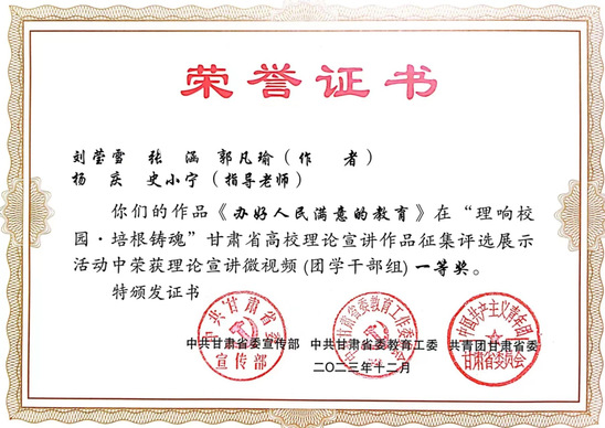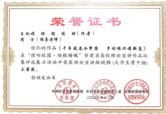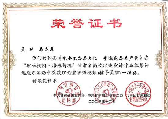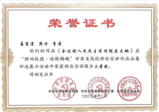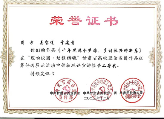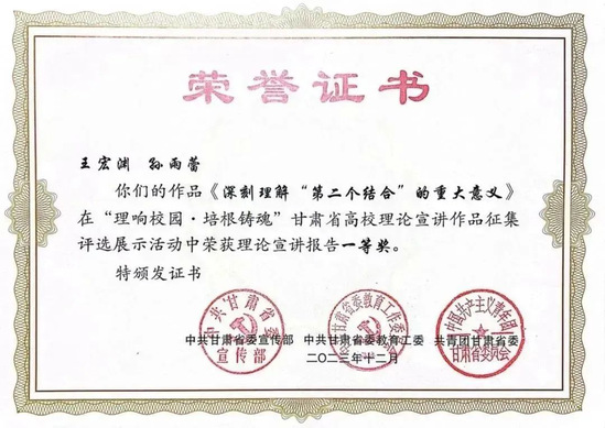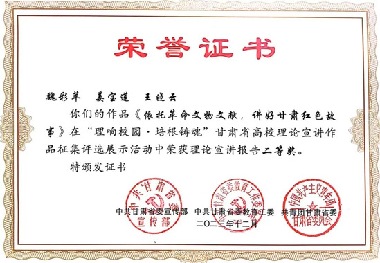 新葡萄官网党委副书记王宏渊、孙雨蕾老师的作品《深刻理解“第二个结合”的重大意义》,马乔恩教授的作品《总书记来了布楞沟村》,苗昕老师的作品《高扬奋斗主旋律 砥砺前行新征程——新时代巩固壮大主流思想舆论何以可能》荣获理论宣讲报告一等奖;毛娅楠老师的作品《百年大党的胜利:归根到底是因为马克思主义行》,周方、姜宝莲、于建贵老师的作品《千年夙愿今梦圆,乡村振兴谐新篇》,魏彩苹、姜宝莲、王晓云老师的作品《依托革命文物文献,讲好甘肃红色故事》荣获理论宣讲报告二等奖;姜宝莲、周方老师和李丹同学的作品《全过程人民民主浸润陇原大地》荣获理论宣讲报告三等奖。