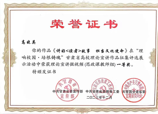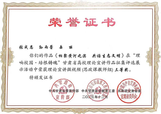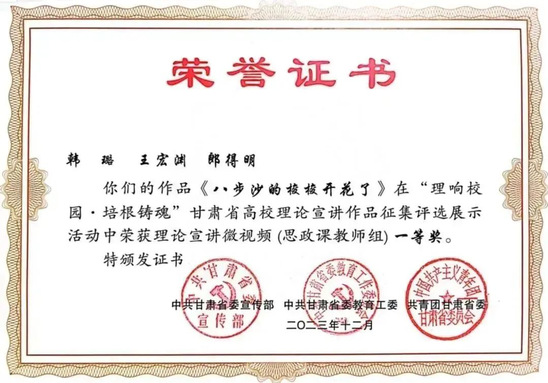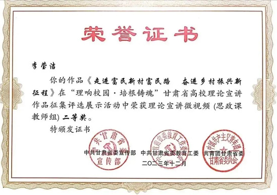 韩璐老师的作品《八步沙的梭梭开花了》,高晓英老师的作品《讲好〈读者〉故事文化使命》荣获理论宣讲微视频“思政课教师组”一等奖;孟迪、马乔恩老师的作品《吃水不忘总书记 永远感恩共产党》荣获理论宣讲微视频“辅导员组”一等奖;刘莹雪、张涵、郭凡瑜同学的作品《办好人民满意的教育》荣获理论宣讲微视频“团学干部组”一等奖;李莹洁老师的作品《走进富民新村富民路 奋进乡村振兴新征程》荣获理论宣讲微视频“思政课教师组”二等奖;张成恩、孙雨蕾、岳丽老师的作品《相聚黄河之滨 共话生态文明》荣获理论宣讲微视频“思政课教师组”三等奖;王玲娟、杨铭、陈琼同学的作品《千年夙愿今梦圆 乡村振兴谱新篇》荣获理论宣讲微视频“大学生骨干组”三等奖。