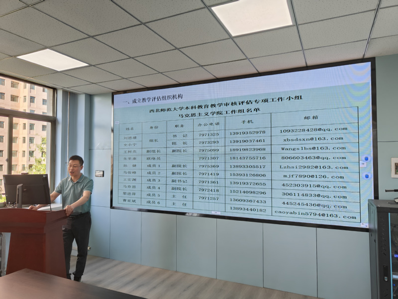 学院副院长、本科教育教学评估小组副组长王树亮,就成立教学评估组织机构、评估方案制定、教育教学评估组织动员、各小组工作分组、上一轮教育教学评估整改情况、相关教学制度整理等工作向督导组作了详实的汇报。