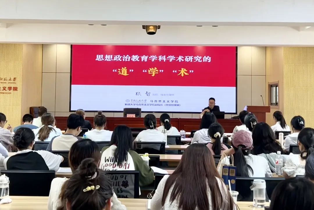 张智教授首先结合自身研究经历和学术成果,教导同学们一定要树立和增强思想政治教育学科的专业自觉、学科自信,努力构建好思想政治教育学科的知识体系。他从思想政治教育学科学术研究的“道”“学”“术”三个问题展开本次讲座。“道”从什么是思想政治教育为切入口,明确了马克思主义思想政治教育的理论基础、基本范式、学科视野等;“学”从怎么学习思想政治教育的角度,梳理了思想政治教育基础理论、党和国家方针政策、思想政治工作实践等学科前沿问题;“术”围绕怎样做好思想政治教育,分享了思想政治教育学科学术论文选题、写作以及投稿问题。