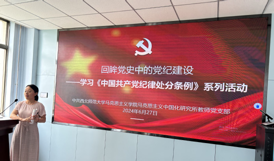 马克思主义中国化研究所教师党支部书记、所长姜宝莲副教授以专题党课方式,讲授了一百多年来中国共产党在不同历史时期,面对不同形势任务,加强党员纪律教育的不同举措,确保党在革命、建设、改革和新时代始终保持先进性、纯洁性的经验与成就。