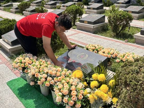 英雄校友陈红军的墓区位于英魂苑4排6号,墓碑前摆满了鲜花。陈红军烈士在最艰苦的边疆守卫祖国,在最危险的时候挺身而出,在最年轻的岁月与世长辞,祖国不会忘记他,人民更不会忘记他。实践团成员们怀着崇敬的心情为陈红军烈士轻轻擦拭墓碑,表达着对陈红军烈士的无尽追思和敬仰之情。