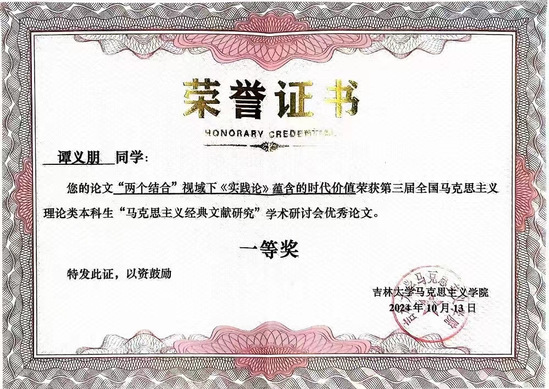 为深入学习贯彻习近平新时代中国特色社会主义思想和党的二十大精神,夯实马克思主义理论类本科生阅读经典著作功底,不断提升本科生学术素养与科研能力,10月12日-13日,新葡萄官网本科生谭义朋参加了吉林大学举办的第三届全国马克思主义理论类本科生“马克思主义经典文献研究”学术研讨会。谭义朋提交的学术论文《“两个结合”视域下<实践论>蕴含的时代价值》荣获一等奖。