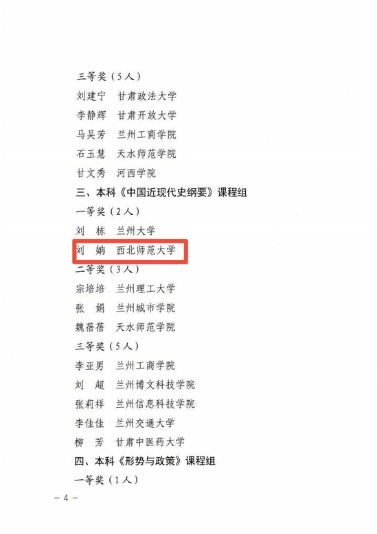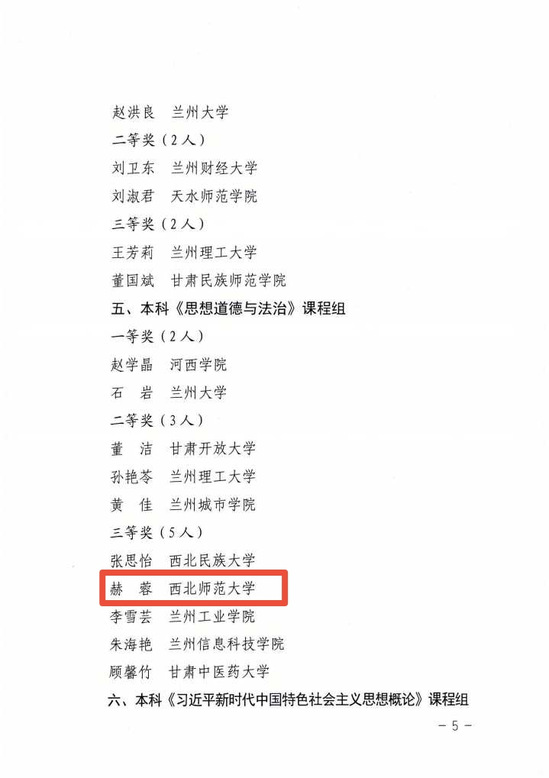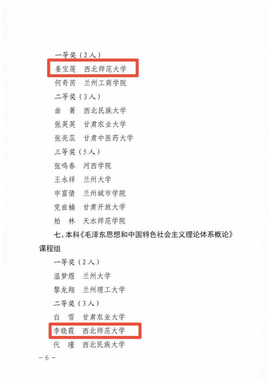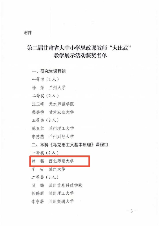 近日,省委宣传部、省委教育工委印发了《关于公布第二届甘肃省大中小学思政课教师“大比武”教学展示活动获奖教师名单的通知》,新葡萄8883官网AMG教师团队在本次比赛中荣获多项奖励,校团委书记、新葡萄8883官网AMG韩璐副教授获本科《马克思主义基本原理》课程组一等奖;新葡萄8883官网AMG副院长姜宝莲副教授获本科《习近平新时代中国特色社会主义思想概论》课程组一等奖;刘姌副教授获本科《中国近现代史纲要》课程组一等奖;李晓霞副教授获本科《毛泽东思想和中国特色社会主义理论体系概论》课程组二等奖;赫蓉副教授获本科《思想道德与法治》课程组三等奖。