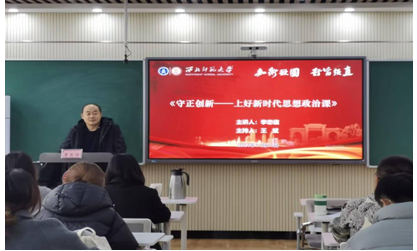 李忠信结合自身教学工作经历,从理论阐释和教学展示两个方面展开讲座。在理论阐释环节,李忠信围绕思想政治理论课的定位与要求、新时代高中思想政治理论课建设的特点与遵循讲述了新时代讲好高中思想政治理论课的关键着力点。在教学展示环节,李忠信以高中思想政治理论课《民族区域自治制度》为例,从教学设计理念、疑难问题处理、课堂动态掌握、课程作业设计等方面作了现场教学展示。