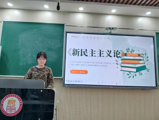 陈力元同学梳理了《新民主主义论》的文章脉络,并简要阐述了新民主主义的政治、经济和文化的相关内容。文中毛泽东将马克思主义基本原理同中国具体实际相结合,创造性地提出了新民主主义理论,系统回答了时代和革命斗争实践提出的紧迫问题,指明了中国革命的前景和出路,其所蕴含的科学世界观和方法论为我们解决当前面临的诸多现实问题提供了重要启示。