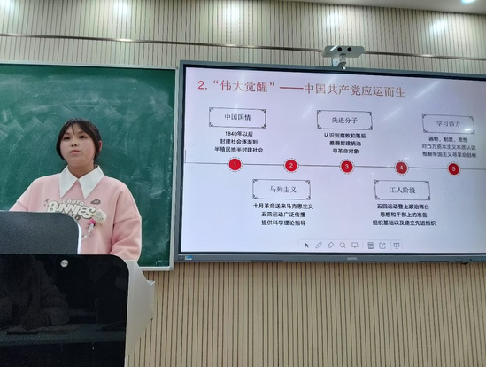 “星星之火,可以燎原”。只要坚持正确的革命策略和路线,即使是在艰难困苦中的小规模斗争,也能够发展成为全国范围内的大革命。陈丽娜同学分析了《中国共产党和中国革命战争》章节内容,结合当时的重大革命事件,阐述了中国共产党一百多年来的艰苦奋斗历程及其深刻影响,帮助同学们进一步理解历史和人民选择中国共产党的历史逻辑。