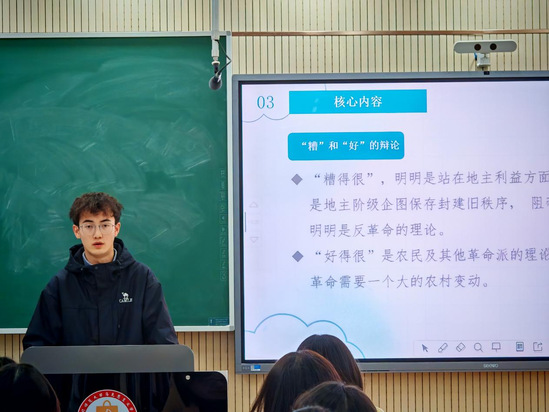 马堂同学介绍《湖南农民运动考察报告》的相关内容。文中毛泽东驳斥了对农民运动的错误言论,肯定了农民运动的正确性,提出放手发动群众、建立革命政权和武装,科学分析农民阶层的策略。