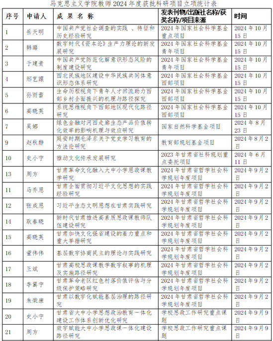 以学科建设为龙头,塑造学院高质量发展新优势,在学科规划、科研项目和学术交流等方面取得了卓越成效。深入推进西北边疆政治与治理研究中心和党史党建研究中心建设,凝练政治学理论学位授权点的学科特色与定位,圆满通过政治学理论二级学科硕士学位授权点的周期性合格评估。聚焦科研发展新局面,开展有组织的科研,积极动员学院教师申报各类研究项目,全年获批各类科研项目52项,其中教育部高校思政课教师研究专项重大项目1项,国家社科基金项目6项,国家自然科学基金项目1项,教育部人文社科一般项目2项、青年基金项目1项,甘肃省社科项目12项、甘肃省教育厅项目6项,科研项目“量质齐升”,实现了历史性突破,为进一步推动学科建设注入了新动能。鼓励开展常态化、长效化的学术交流,搭建多维度的学术交流平台,通过“人文讲坛”“政治学前沿”“马克思主义经典读书会”等品牌学术活动,围绕学科特色、人才培养、思政课教学和党史党建等年度学术热点和前沿问题,邀请专家举办学术报告34场。