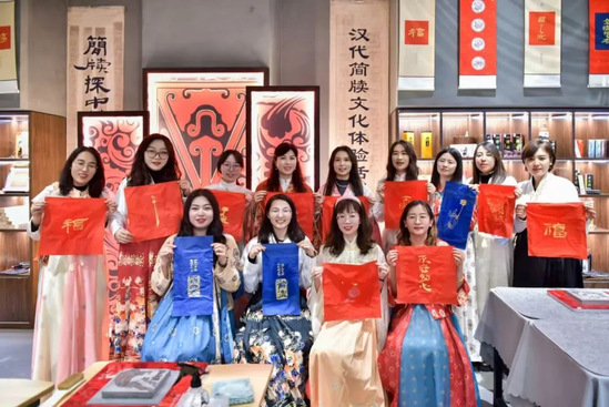 为进一步深化对中华优秀传统文化的理解与感悟,活动特别设置了“汉文化沉浸式体验”环节。在金石传拓工作坊,女教师们亲手体验了古法拓印技艺,通过敷纸、喷水、捶打、上墨等工序,将简牍纹样与文字复刻于宣纸之上,感受“一纸一墨载春秋”的匠心传承。教师们身着曲裾深衣、齐腰襦裙等汉服,学习传统礼仪,体悟“衣冠上国”的文化内涵。