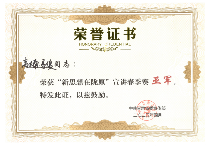 4月29日,新葡萄官网学子高楠、马俊在甘肃省“新思想在陇原”2025年宣讲春季赛总决赛中斩获佳绩。