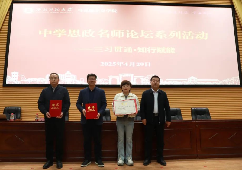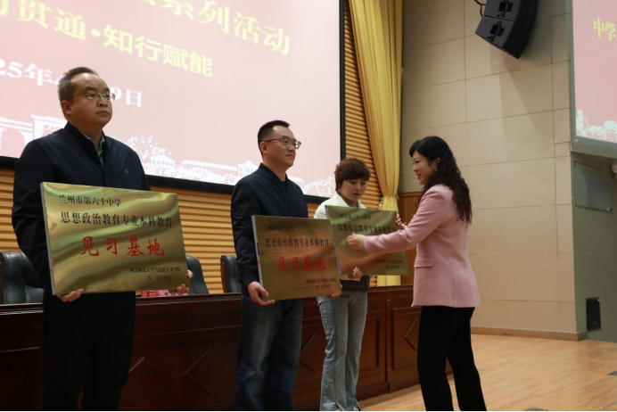 郎得明为兰州市第六十中学党总支书记曹先、兰州市第二十二中学校长刘建会、兰州市第八中学校长吕德峰颁发“教育硕士专业学位校外实践导师”个人聘书,王宏渊向三所中学授“思想政治教育专业本科教育见习基地”牌匾。