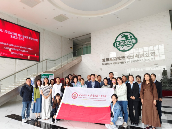 为加强高校与企业全方位交流合作,服务地方经济高质量发展,5月30日,新葡萄8883官网AMG马克思主义中国化研究所教师党支部联合形势与政策研究所,走进兰州庄园乳业有限公司,参观乳制品加工基地,实地感受企业以党建引领产业发展的生动实践,与企业党支部共同举办“内化中央八项规定精神 提升踏实干事创业动能”主题党日活动暨集体备课会。