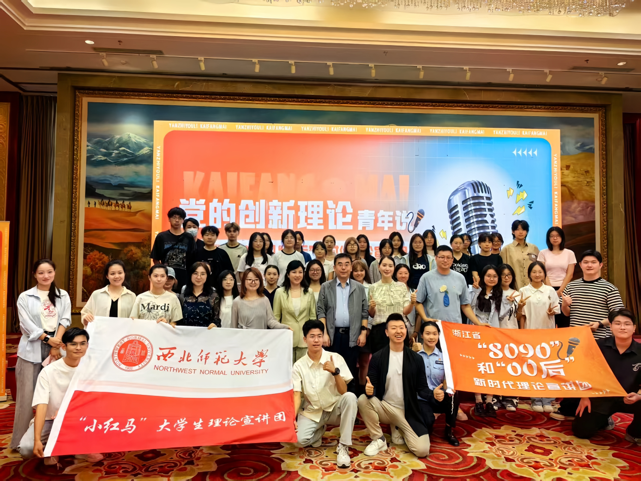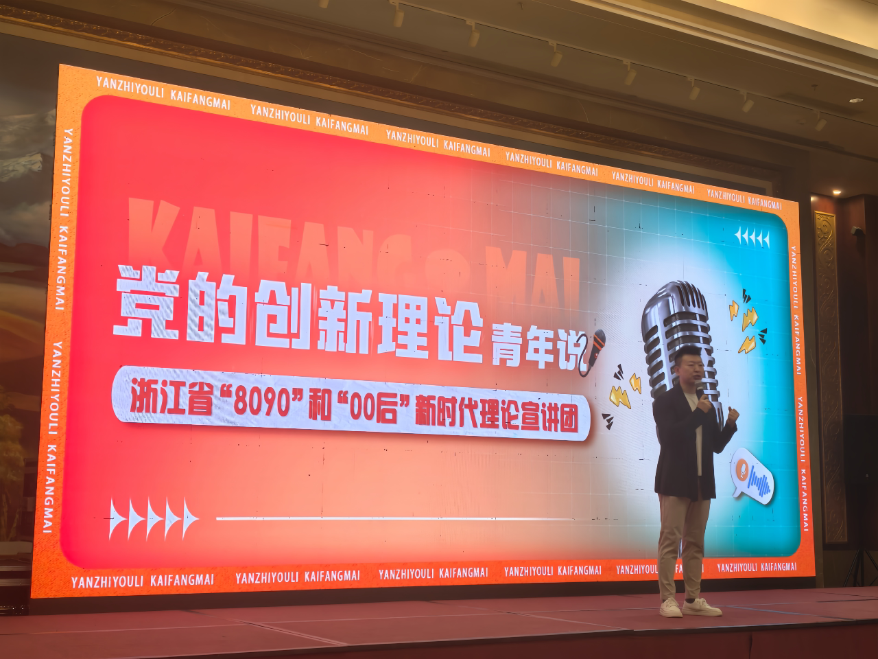 来自浙甘两地的10名宣讲员围绕乡村振兴、基层治理、文化传承等热点话题,打破传统的“我说你听”宣讲模式,以开放麦的宣讲形式,用“青言青语”讲述党的创新理论。从南北两山绿化到为民服务答卷,再到哪吒悟空来了,宣讲团成员把宣讲主题细化为一个个与大学生息息相关的小切口,让宣讲能“共情”,有“共鸣”,带来了一场充满青春活力与思想深度的盛宴。