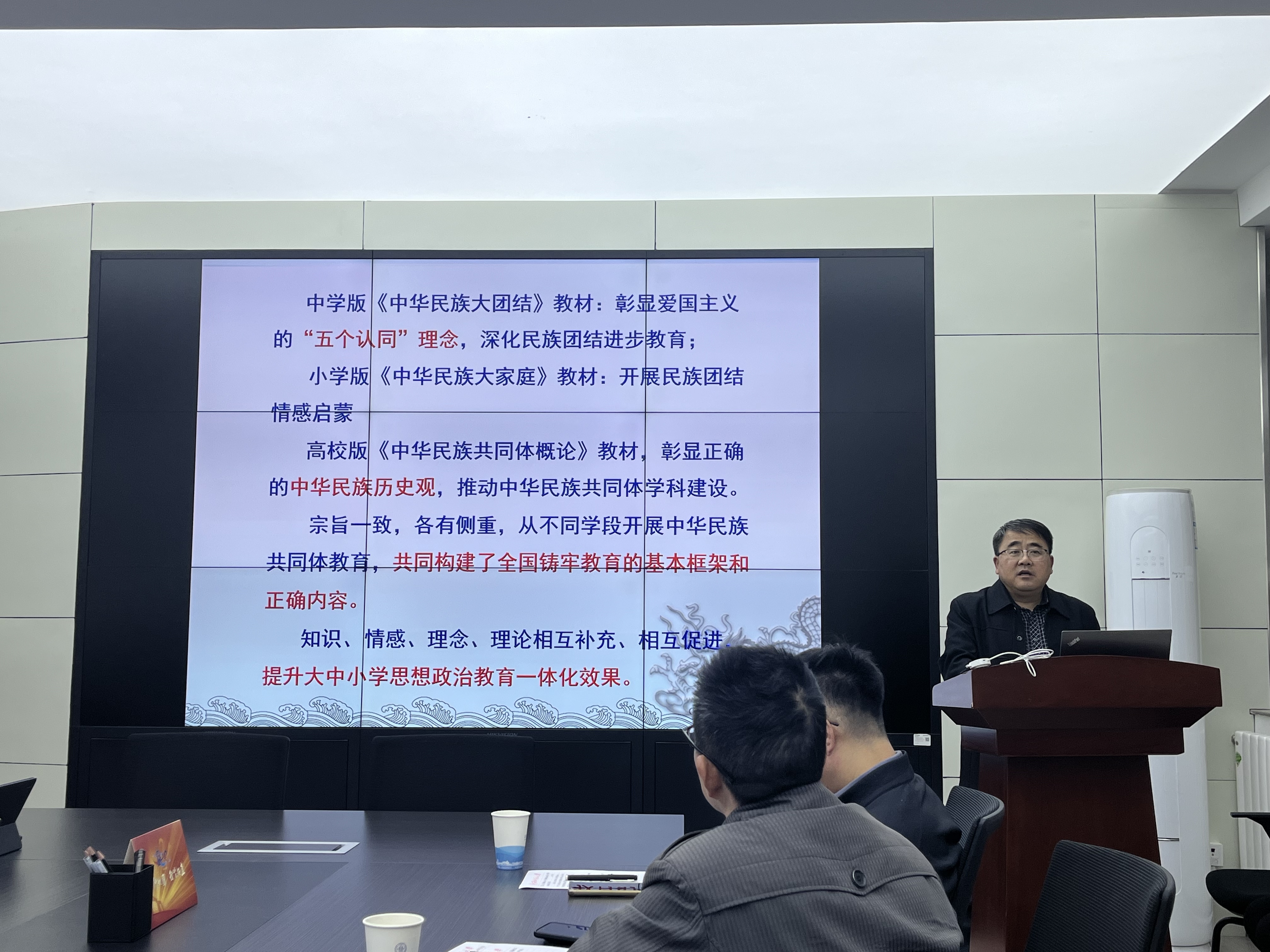 戢广南研究院作了题为《新时代学校铸牢中华民族共同体意识教育的理论政策与实践》的领学,他结合主编全国统编民族团结进步教材《中华民族大团结》的工作实践,分享了新疆地方思政课基本定位、鲜明特色、教材建设、教学重难点等方面的做法,解读了民族团结进步教育的基本内容,强调了新时代加强民族团结进步教育的重要意义。