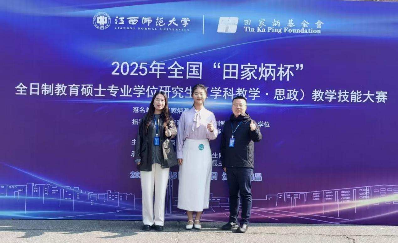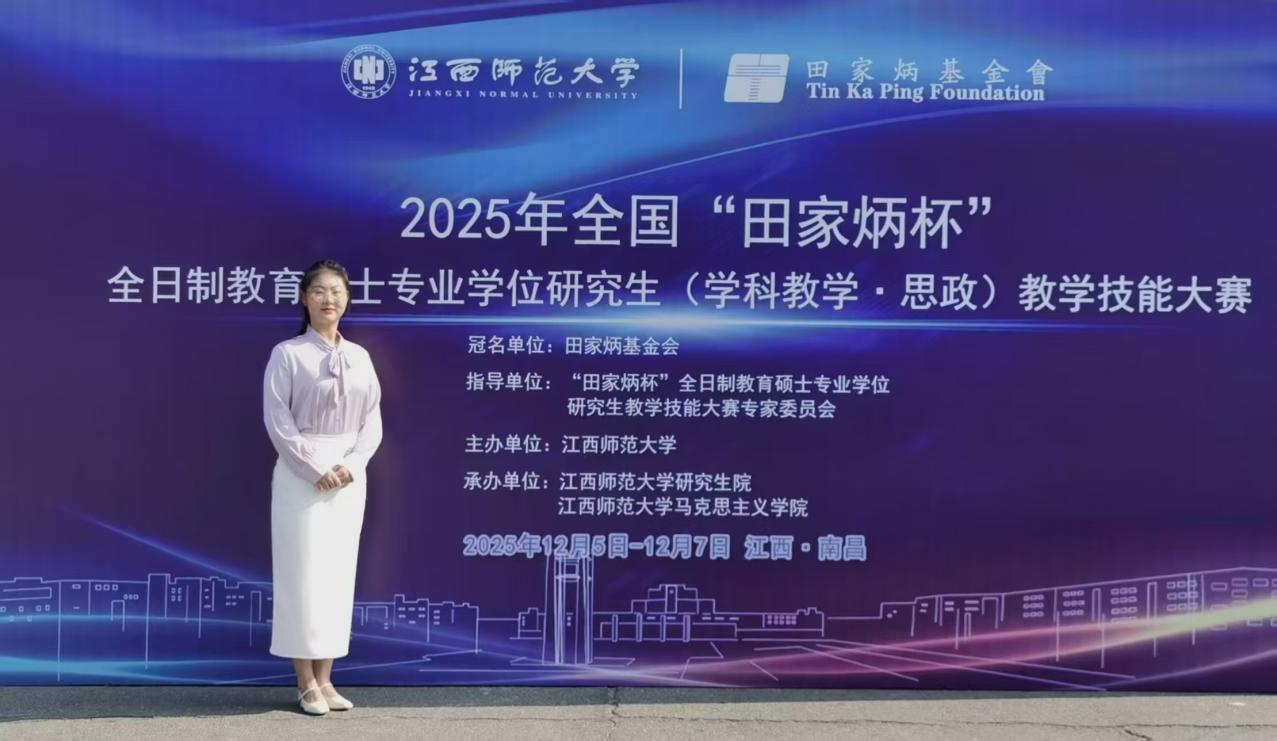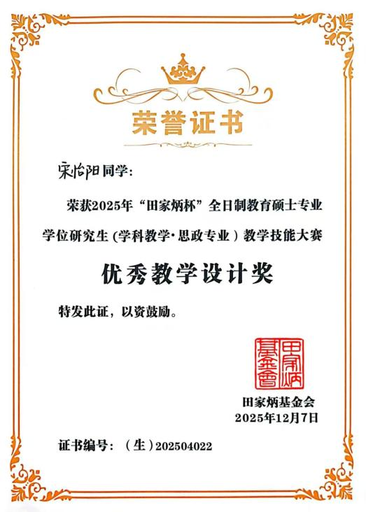 12月5-7日,2025年全国“田家炳杯”全日制教育硕士专业学位研究生(学科教学·思政)教学技能大赛决赛在江西师范大学举行。新葡萄官网2024级学科教学(思政)专业研究生宋怡阳荣获“优秀教学设计奖”。