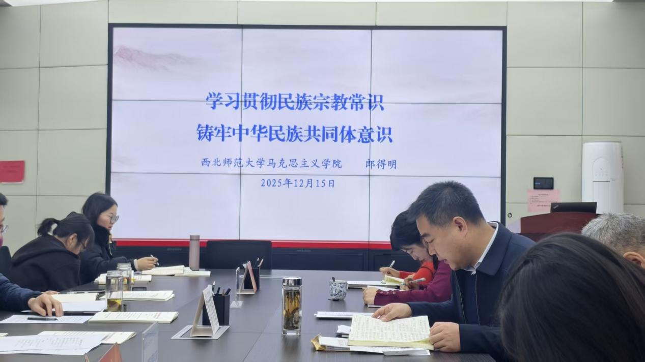 郎得明围绕意识形态、民族宗教工作,作了《学习贯彻民族宗教常识 铸牢中华民族共同体意识》的专题辅导报告。党委中心组成员围绕学习议题和报告内容作交流研讨。