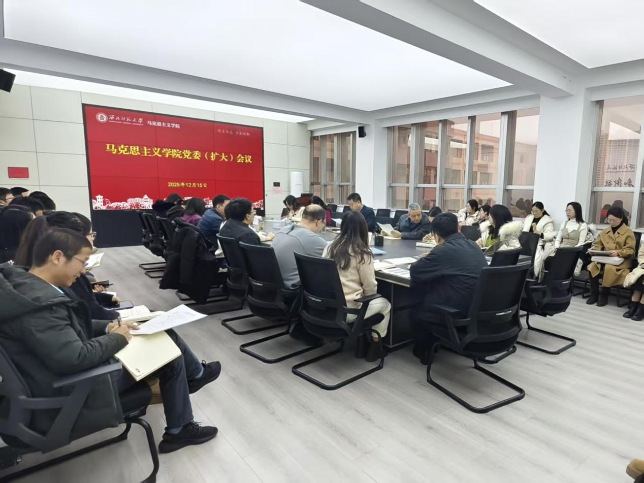 12月15日(星期一)上午8:30,学院召开党委(扩大)会议,部署近期党建工作重点任务。会议由学院党委书记郎得明主持,学院党委委员、班长成员参会,各党支部书记、副书记,各系所中心主任、副主任,全体学工干部、班主任列席。